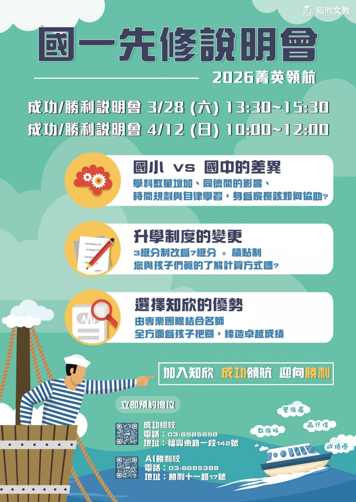 為了讓更多孩子順利銜接國中生活,我們將在4/12(日)本週舉辦國一先修家長說明會